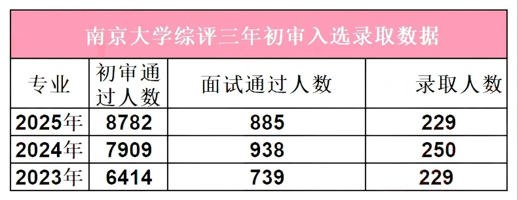 南京大学综合评价近三年报名人数以及初审通过人数呈逐年递增的趋势,但近三年的录取人数基本保持不变,2025年甚至还缩招了20人,竞争十分激烈。