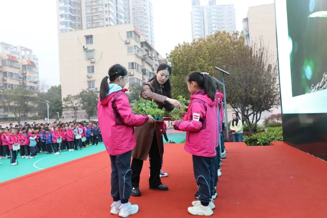 四载耕耘,步履不停。本届种植节立足现有成果,进一步丰富实践内容,细化本学期劳动实践安排,将劳动育人落到实处。在全场师生的期待中,刘志华副校长亲自为各个班级发放精心挑选的优质菜苗。翠绿鲜嫩的菜苗整齐摆放,承载着春日的生机与成长的希望,各班学生代表有序上前,双手接过寄托着劳动期待的菜苗,脸上洋溢着兴奋与憧憬。
