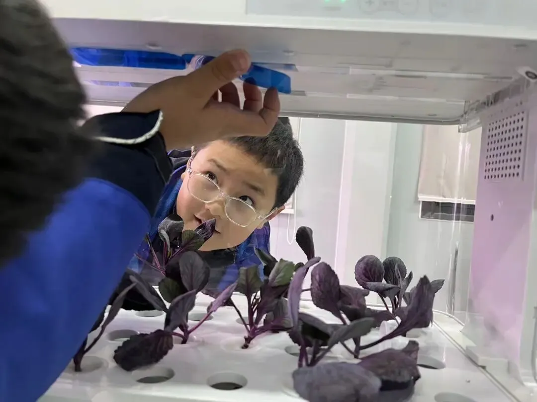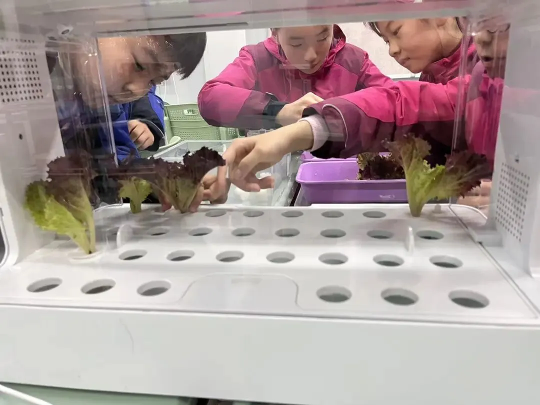与此同时,学校为本学期专项配置6个标准化班级水培箱,进一步深化劳动与科技的融合实践。水培实践将面向各年级有序开展,班级全程负责一整学期的种植、管护、观察、记录工作,到期后按班级序号依次轮换,保障每个参与班级都能拥有完整、连贯的水培种植实践周期,让更多学生体验无土栽培的科技魅力。学校鼓励各班建立专属水培观察日志,详细记录作物生长周期、营养液调配、生长状态变化等内容,精心呵护水培作物生长。自此,同学们既能在东篱园体验传统土培种植,感受农耕劳作的质朴乐趣,也能系统学习现代水培技术,在两种种植方式的对比探究中,感受传统劳动与现代科技的独特魅力,拓宽科学视野。