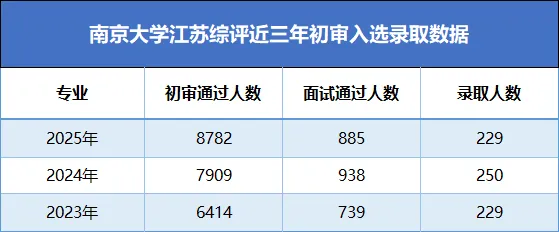 南京大学综合评价近三年报名人数以及初审通过人数呈逐年递增的趋势,但近三年的录取人数基本保持不变,2025年甚至还缩招了20人,竞争十分激烈。