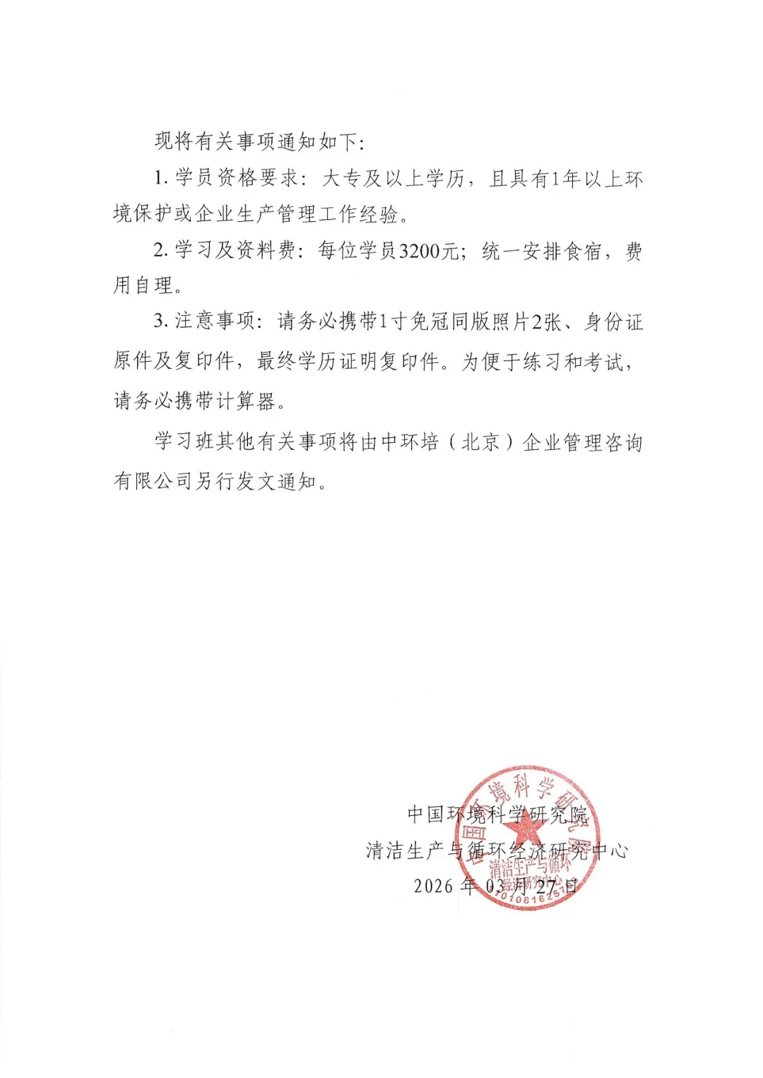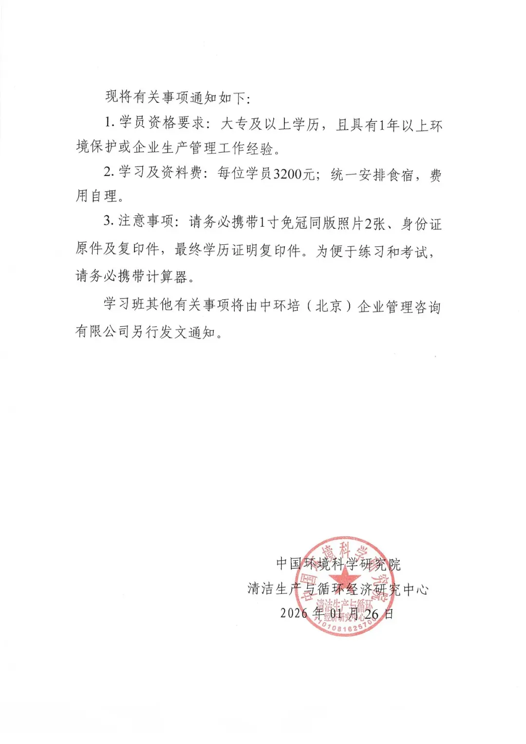 (一)学员认真参加学习并考核合格后,由中国环境科学研究院清洁生产与循环经济研究中心颁发证书。