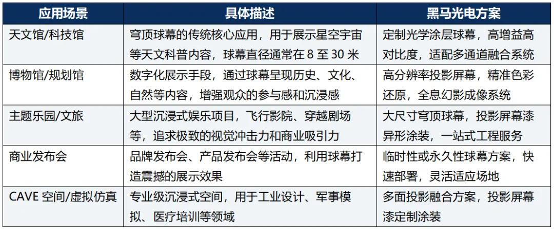 穹顶球幕的应用场景正在不断拓展和深化,已从传统的科普教育延伸到商业娱乐、文化旅游、品牌发布等多个领域。黑马光电的穹顶球幕产品和解决方案,已服务于多种类型的场景需求。业级沉浸式空间,用于工业设计、军事模拟、医疗培训等领域。