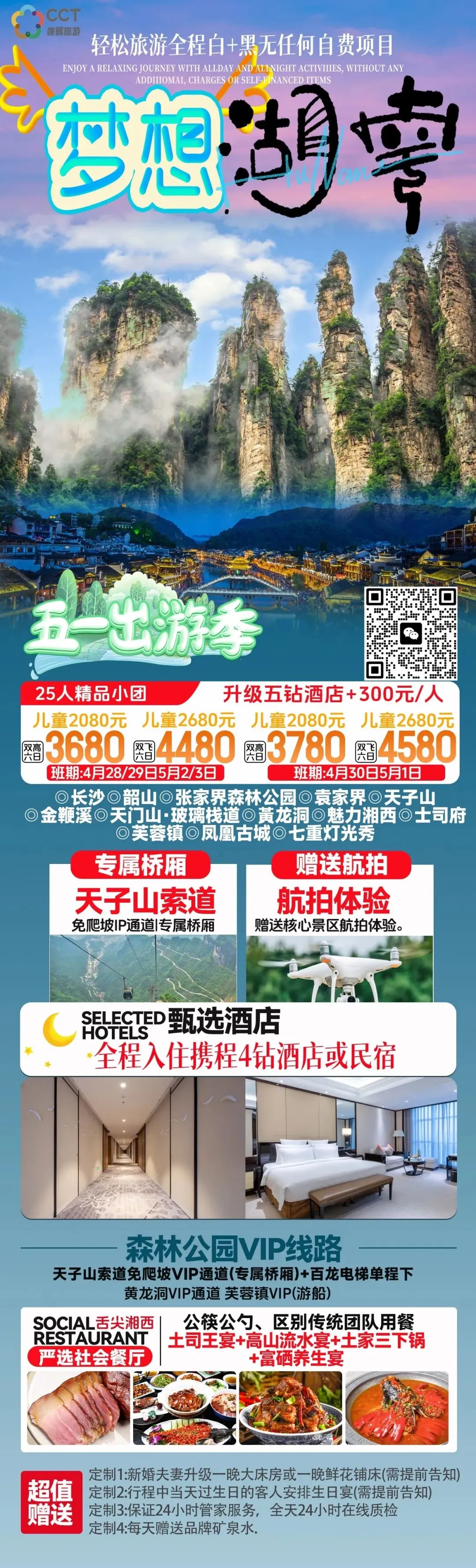 ★精选景点:张家界森林公园、黄龙洞、天门山国家森林公园、芙蓉镇、凤凰古城、韶山、魅力湘西表演