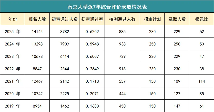 从表中可以看出从2022年开始南京大学的综合评价报考人数逐年增加,从2022年的8847人增加至2025年的14144人,招生人数在230-250人之间,报录比从2022开始上升逐年增加,到2025年已经达到62:1。