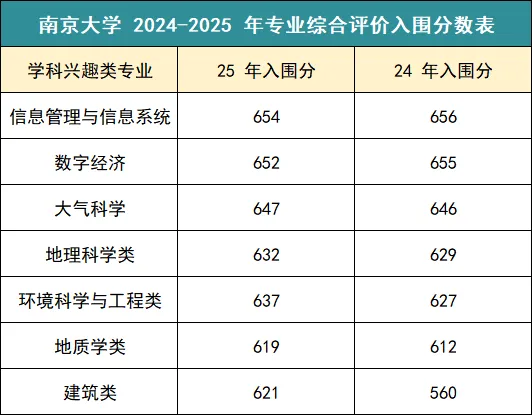 从南京大学2024-2025年综合评价入围分数可看出除了2024年的建筑类560分较为特殊,剩余年份在各专业的入围分数线均在610分以上,其中2025年,入围分数线最高的是信息管理与信息系统专业,最低的为地质学类专业。