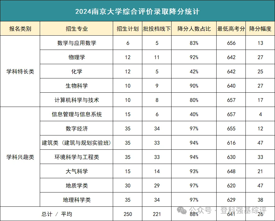 2024年南京大学通过综评招生录取250人,其中221人降分录取,最大降分幅度高达47分(建筑类(建筑与规划实验班)和地质学类)。