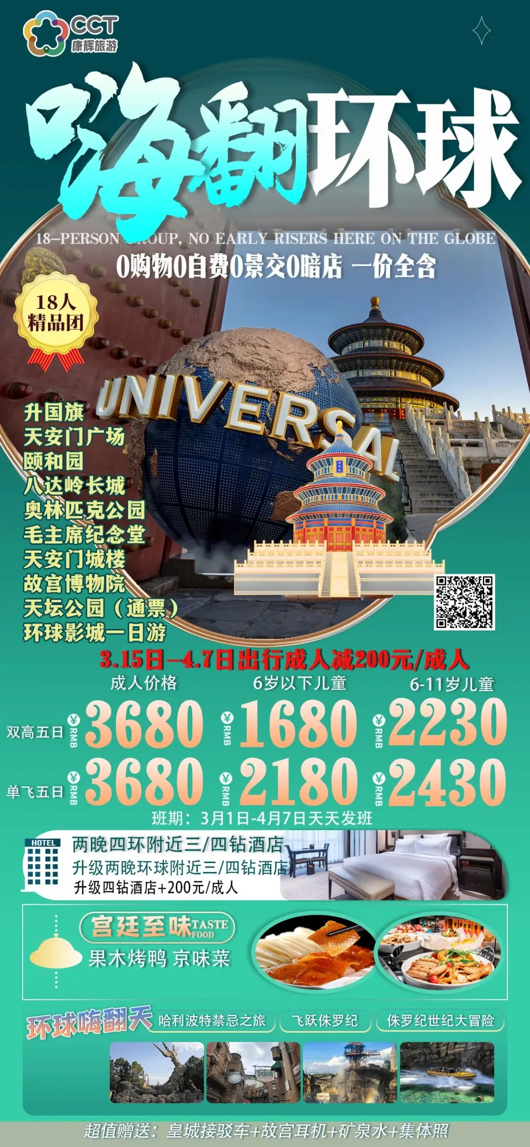 6.景点:升国旗、颐和园、八达岭长城、天安门城楼、故宫博物院、天坛公园(通票)、环球影城一日游。