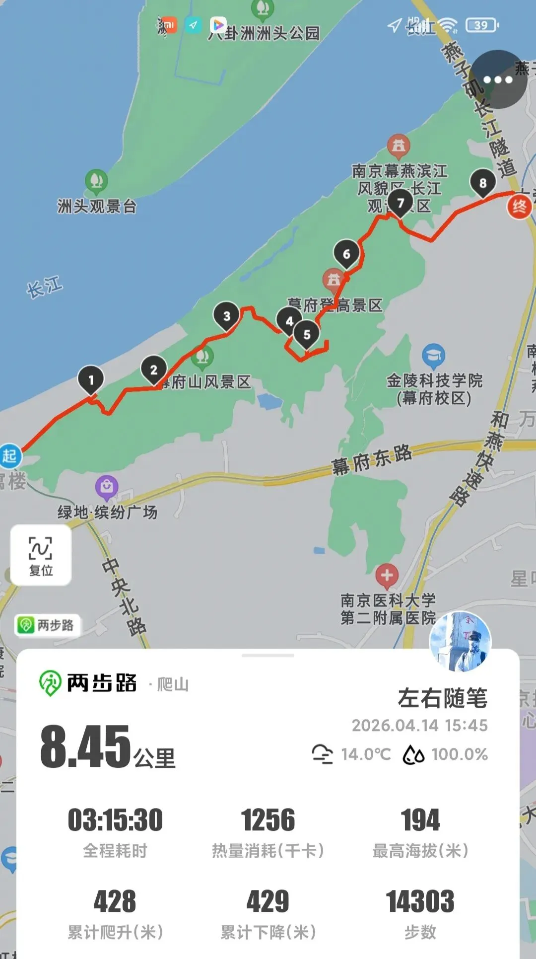 附图:4月14日下午三点离开公司,三号线地铁上元门登山起点——幕府山风景区——幕府登高景区——长江观音景区,全程徒步8.45公里,终点燕子矶,用时3小时15分钟。2026年4月15日