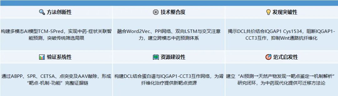 Significance and Innovations 总而言之,这项研究是一个融合人工智能、天然药物化学、分子生物学和疾病模型的交叉学科典范,系统性地完成了从“AI预测”到“药效验证”再到“靶点与机制深度阐释”的完整药物发现链条,为慢性肾病的治疗提供了全新的候选药物和分子机制。