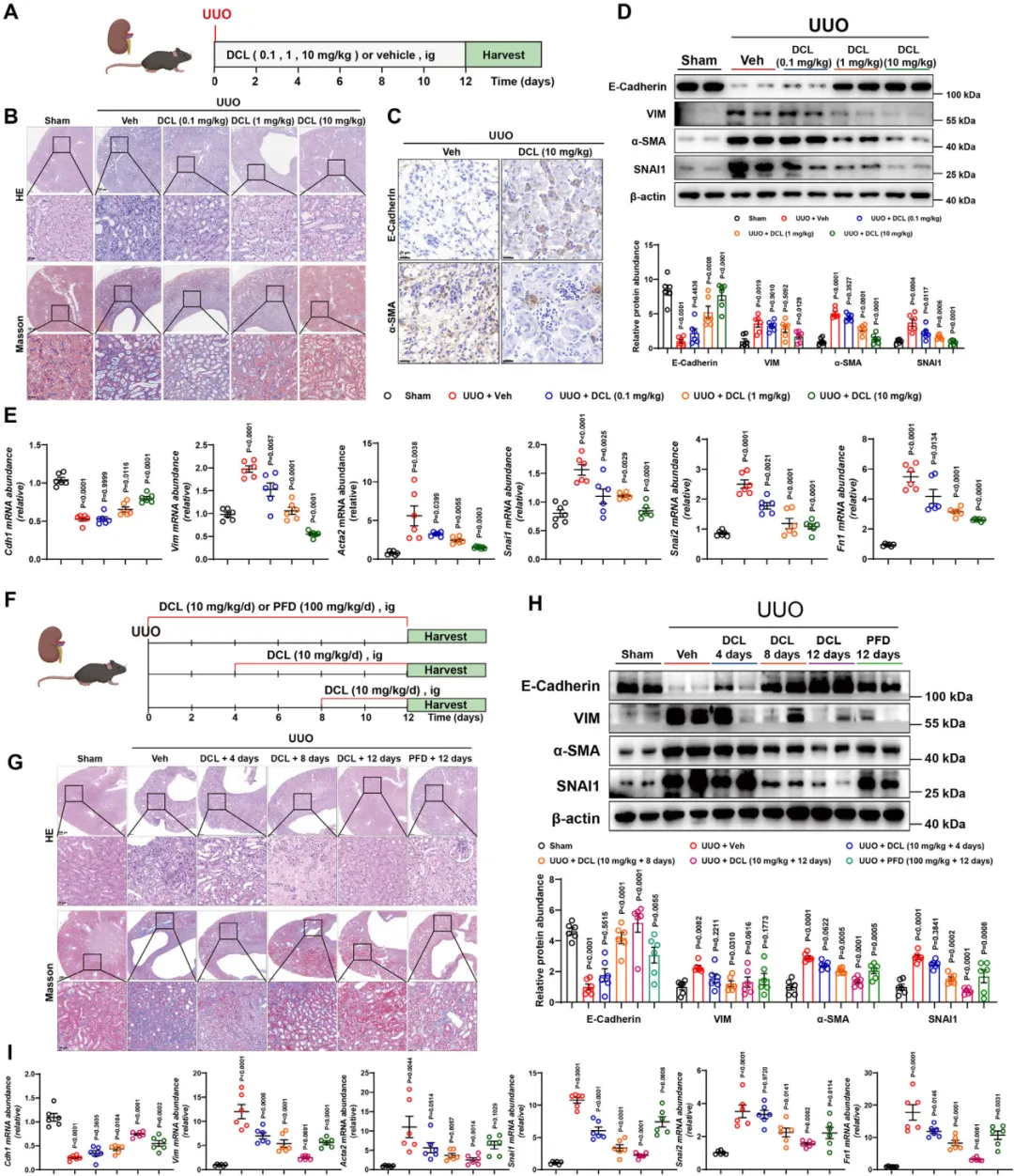 与阳性药吡非尼酮相比,DCL在治疗4天和8天后均表现出更优的抗纤维化效果【图3F-I】。这些数据强有力地证明了DCL自身就具备良好的抗肾纤维化活性。