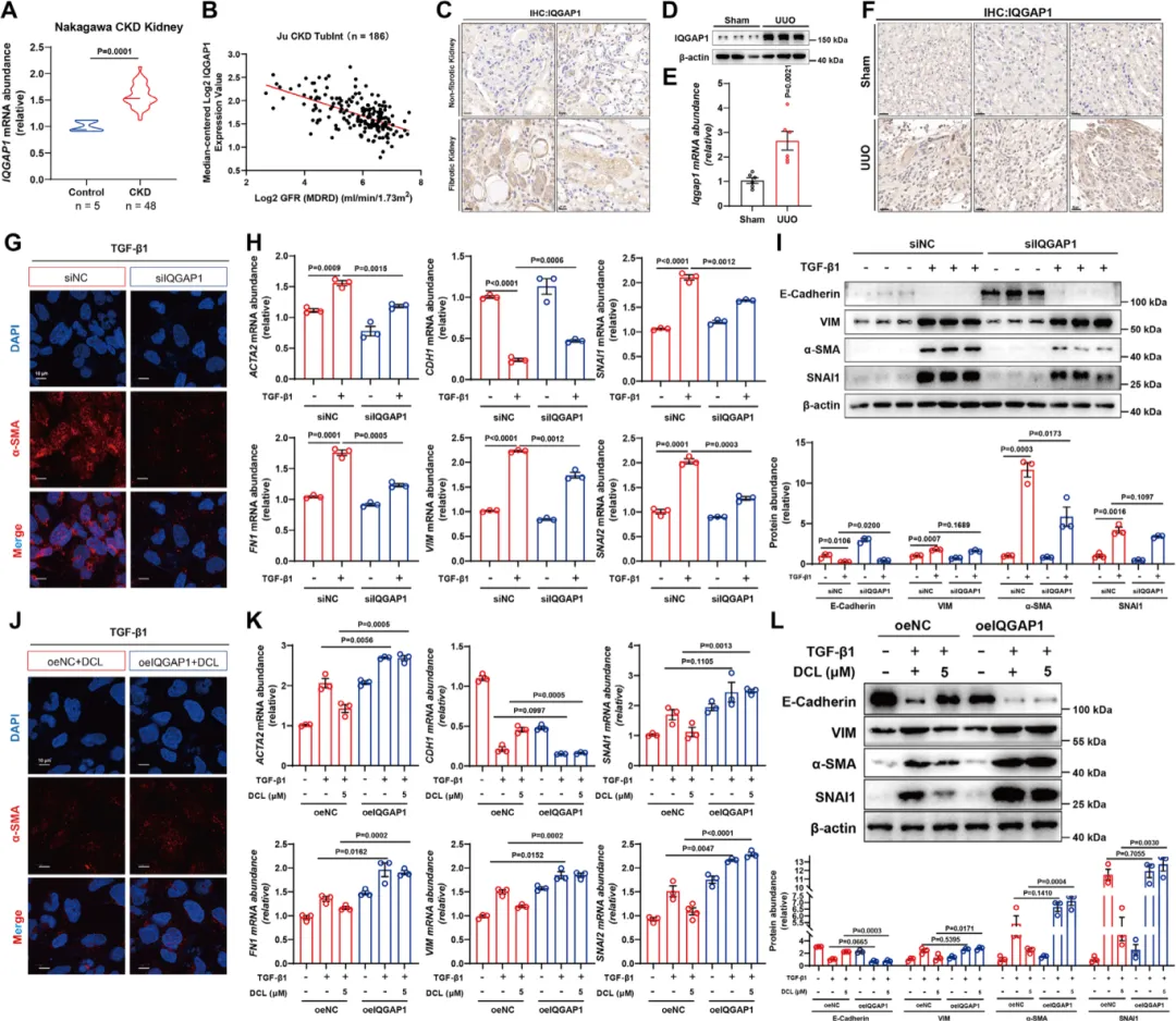 分析临床数据库和患者样本发现,肾纤维化患者的肾脏中IQGAP1的表达水平显著升高,且与肾功能指标呈负相关【图5A-C】。