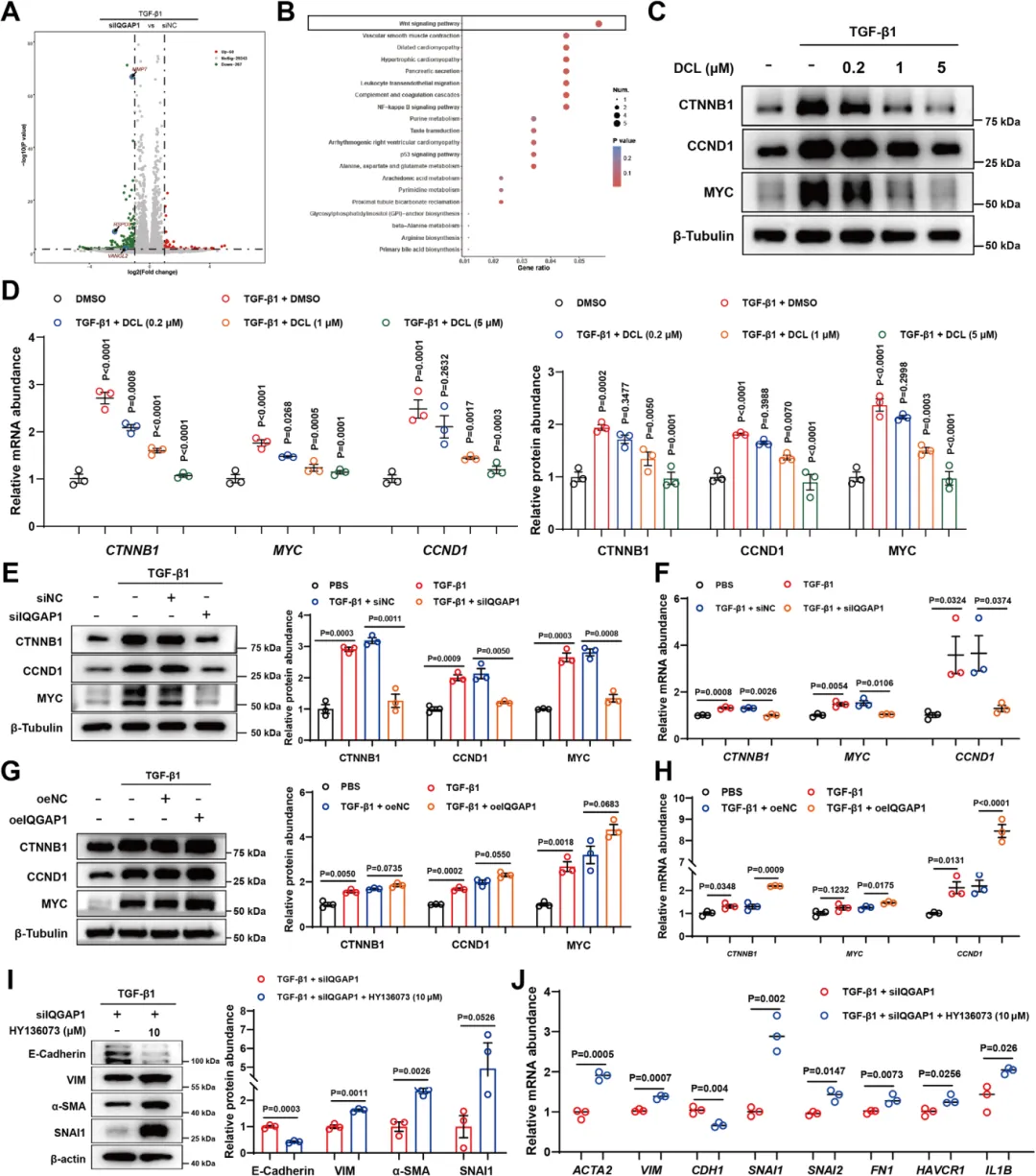 转录组KEGG分析显示,IQGAP1敲低后Wnt信号通路的变化最为显著【图7A, B】。后续实验证实,DCL处理或IQGAP1敲低均可抑制Wnt激活,过表达IQGAP1则增强该通路,说明IQGAP1的作用确实依赖于Wnt通路【图7C-J】。