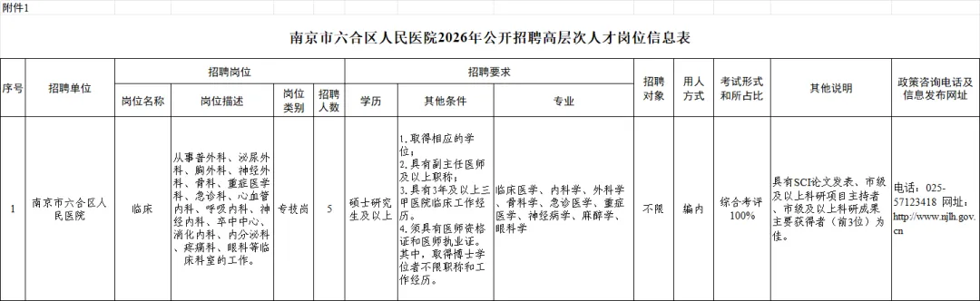 本次招聘相关信息在南京市六合区人民政府网(www.njlh.gov.cn)和南京市六合区人民医院网(www.lhry.cn)等网站发布,具体的招聘岗位、数量、资格条件等详见《南京市六合区人民医院2026年公开招聘高层次人才岗位信息表》(附件1,以下简称《岗位信息表》)。