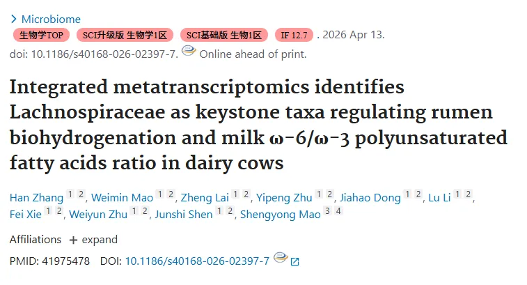文章标题:整合宏转录组学鉴定毛螺菌科为调控瘤胃生物氢化及牛奶ω-6/ω-3 PUFA比例的关键菌群