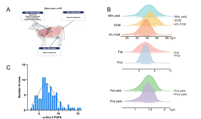 牛奶是全世界广泛消费的营养食品,但其常规产品中ω-3 PUFA含量低,本研究通过整合宏转录组学、扩增子测序和靶向代谢组学,系统解析了瘤胃微生物调控牛奶ω-6/ω-3 PUFA比例的机制。