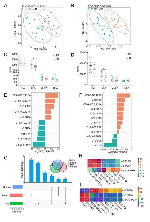 基于GC-MS/MS的靶向代谢组学分析显示,HFR与LFR组在瘤胃、血清和牛奶中均存在显著的脂肪酸差异。LFR组瘤胃中总SFA和PUFA浓度较低,但ALA和花生四烯酸比例更高;HFR组则富含LA及其异构体,ω-6/ω-3比例更高(图2)。