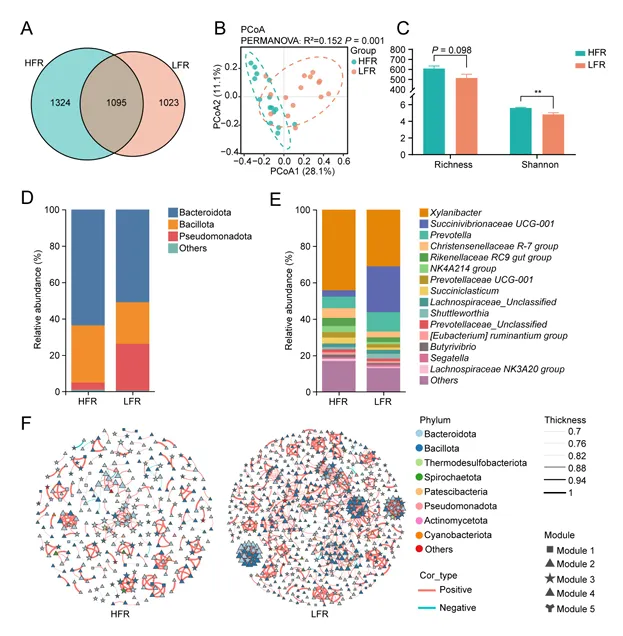PCoA分析显示HFR与LFR组细菌群落显著分离,而真菌也有差异,但产甲烷古菌和原生动物无显著差异。HFR组细菌Shannon多样性更高,LFR组原生动物多样性更高(图3)。