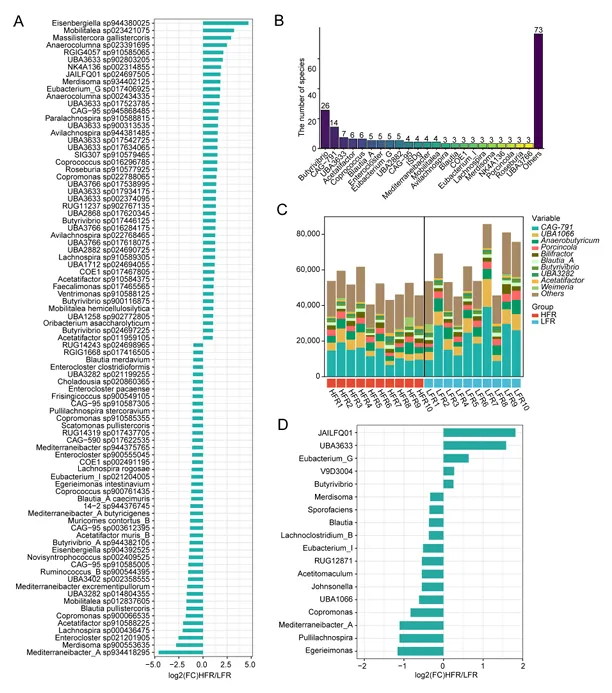 功能注释发现,HFR组中大多数异构酶基因的表达水平显著高于LFR组。这些异构酶基因主要来源于Lachnospiraceae、Anaerovoracaceae和Oscillospiraceae等(图5)。