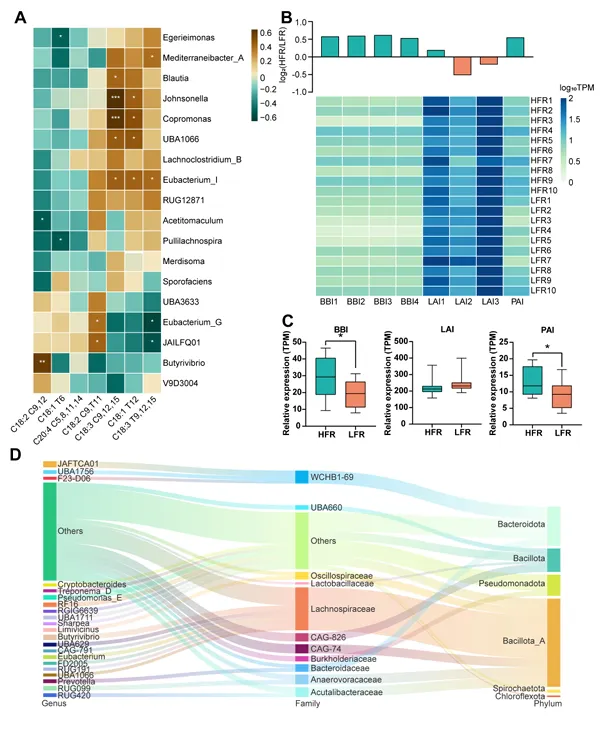 这表明瘤胃微生物是调控牛奶脂肪酸组成的关键因素,为后续微生物靶向干预提供了理论依据。