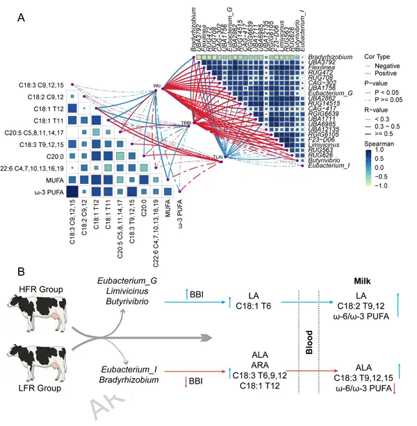 相反,LFR组以Eubacterium_I和Bradyrhizobium为主导,BBI水平降低,与ALA、ARA和C18:3 T9,12,15的代谢通量改变相关,对应更低的牛奶ω-6/ω-3比例。
