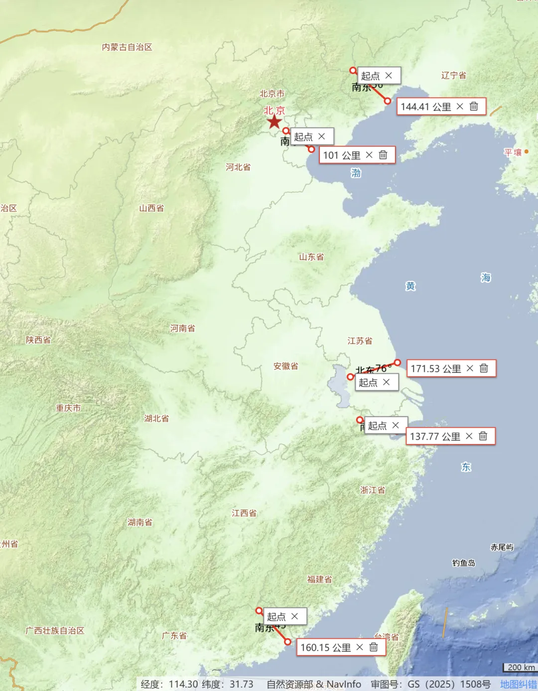 原来,北京到海边的距离比南京到海边近得多