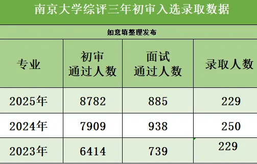 南京大学综合评价近三年报名人数以及初审通过人数呈逐年递增的趋势,但近三年的录取人数基本保持不变,2025年甚至还缩招了20人,竞争十分激烈。