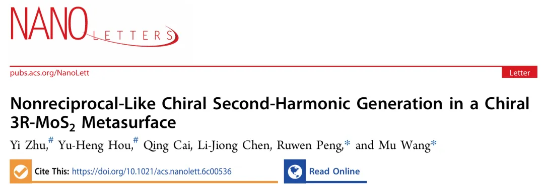 Yi Zhu, Yu-Heng Hou, Qing Cai, Li-Jiong Chen, Ruwen Peng, and Mu Wang,“Nonreciprocal-Like Chiral Second-Harmonic Generation in a Chiral 3R-MoS2 Metasurface” Nano Letters Article ASAP