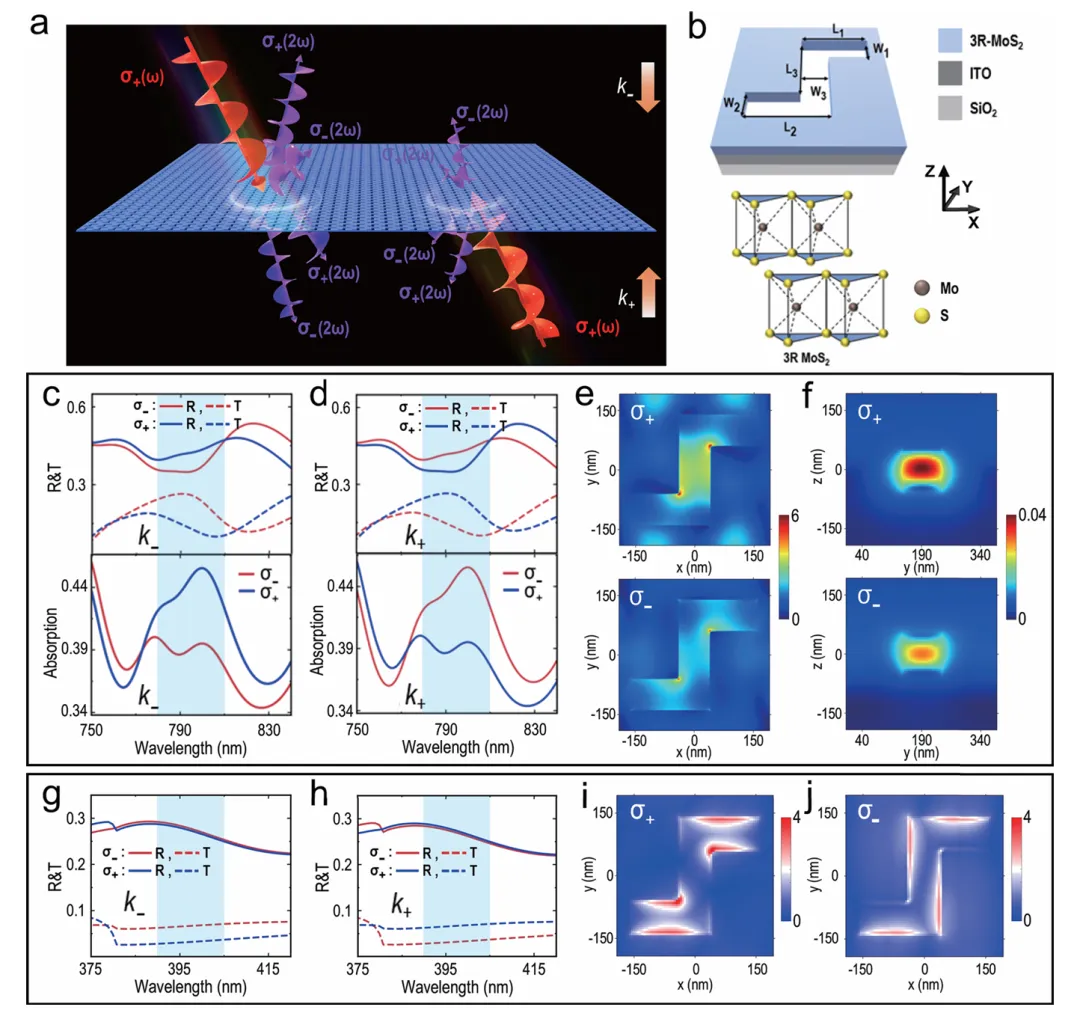 图 1(a) 3R‑MoS₂超表面非互易手性光学效应示意图。此处仅展示 σ+激发情形。(b) 上图:沉积于 ITO 修饰 SiO₂衬底上的 3R‑MoS₂超表面单元结构,几何参数为:L₁ = L₂ = L₃ = 200 nm,W₁ = W₂ = W₃ = 80 nm,周期 Pₓ = Pᵧ = 380 nm,3R‑MoS₂超表面厚度为 110 nm。下图:3R‑MoS₂原子结构示意图。(c)、(d) 分别为 3R‑MoS₂超表面在沿 k-或 k+方向的圆偏振(σ+或 σ-)光照射下,模拟得到的透射、反射及吸收光谱。蓝灰色阴影区域标注了 780–810 nm 的激发波长范围。(e)、(f) 分别为沿 k-方向以 σ+和 σ-光照射(λ = 800 nm)时,单元结构截面的模拟电场分布与磁场分布。(g)、(h) 为 3R‑MoS₂超表面在沿 k-或 k+方向的圆偏振(σ+或σ-)光照射下,400 nm 附近波段的模拟透射与反射光谱。蓝灰色阴影区域标注了 390–405 nm 的激发波长范围。(i)、(j) 分别为在 σ+和 σ-偶极激发(λ = 400 nm)下,3R‑MoS₂超表面的局域态密度(LDOS)模拟结果,均沿 k-方向观测。