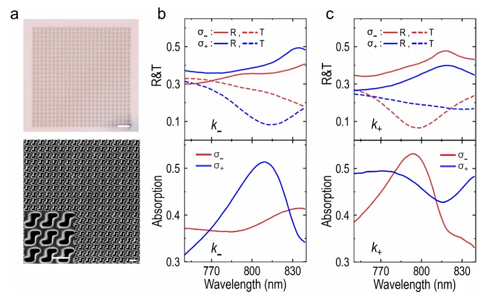 图 2(a) 上图为 3R‑MoS₂超表面的光学显微镜图像,标尺为 1 μm。下图为该超表面的扫描电子显微照片,标尺为 380 nm。下图插图为 3R‑MoS₂超表面的放大视图,标尺同样为 380 nm。(b)、(c) 分别为 3R‑MoS₂超表面在沿k-方向和k+方向的圆偏振(σ+或 σ-)光照射下,实测得到的反射、透射及吸收光谱。
