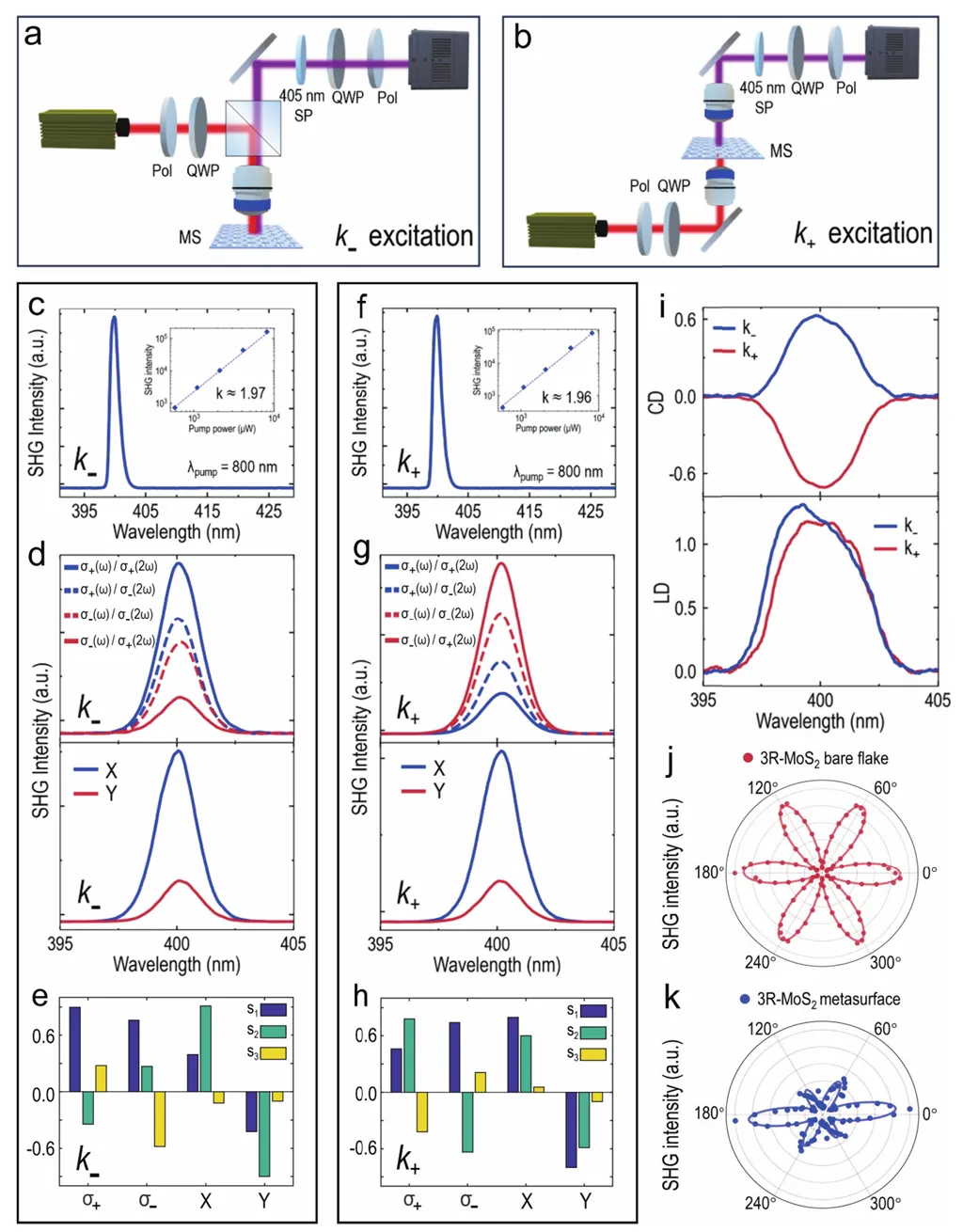 图 3 (a)、(b) 分别为在k-激发与k+激发条件下,沿 k+方向测量二次谐波(SHG)信号的实验装置示意图。(c)、(f) 分别为在 800 nm 波长下,k-激发与 k+激发时 3R‑MoS₂超表面的实测二次谐波光谱。插图为二次谐波的功率‑功率曲线。(d)、(g) 分别为在 800 nm 波长下,k-激发与 k+激发时 3R‑MoS₂超表面的实测圆偏振分辨二次谐波光谱(上图),以及线偏振激发下的二次谐波光谱(下图)。(e)、(h) 为在 800 nm 波长下,圆偏振与线偏振激发时二次谐波信号的实测斯托克斯参数。(i) 为在 800 nm 波长下 k-与 k+激发时,3R‑MoS₂超表面所产生二次谐波的实测圆二色性(CD)与线二色性(LD)光谱。(j)、(k) 分别为裸露 3R‑MoS₂薄片与 3R‑MoS₂超表面在 800 nm 波长 k-激发下,实测的偏振分辨二次谐波信号随泵浦偏振相对 x 轴旋转角 ϕ 的变化关系。圆点为实验数据,曲线为拟合结果。