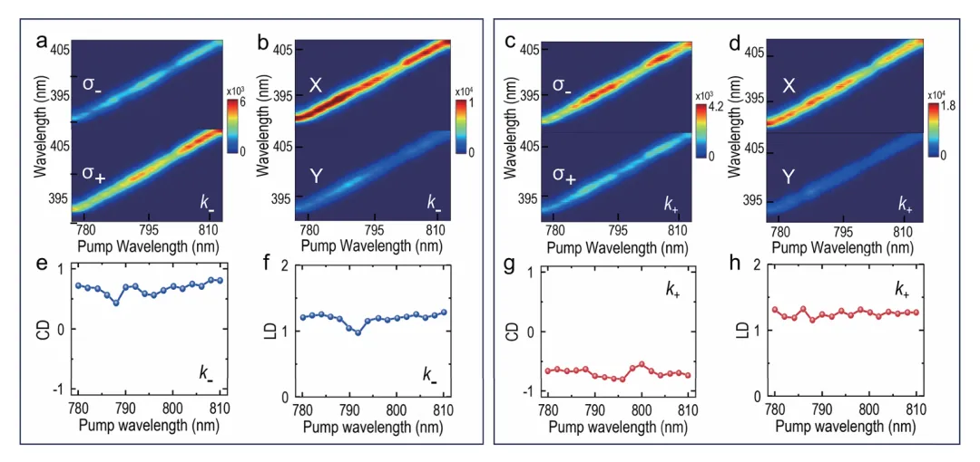 图 4 (a)、(c) 分别为在不同波长下,沿 k-和 k+方向以圆偏振光(σ+或 σ-)激发时,3R‑MoS₂超表面的实测二次谐波(SHG)强度光谱。(b)、(d) 分别为在不同波长下,沿 k-和 k+方向以线偏振光激发时,3R‑MoS₂超表面的实测二次谐波强度光谱。(e)、(g) 分别为沿 k-和 k+方向圆偏振激发时,3R‑MoS₂超表面产生二次谐波的实测圆二色性(CD)光谱。(f)、(h) 分别为沿 k-和 k+方向线偏振激发时,3R‑MoS₂超表面产生二次谐波的实测线二色性(LD)光谱。