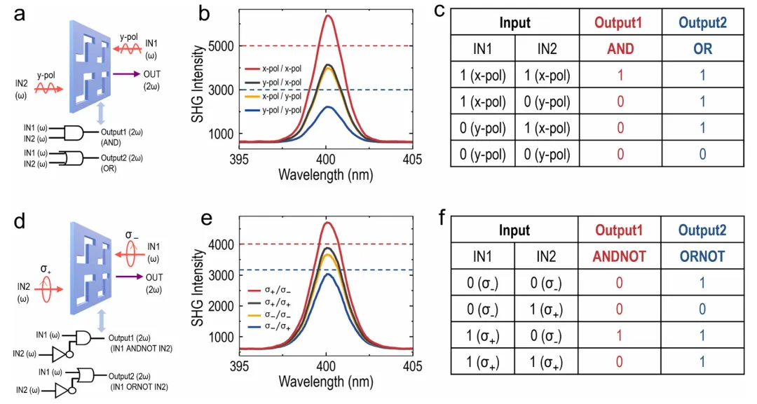 图 5 (a) 基于单个超表面实现与逻辑门(AND)和或逻辑门(OR)的示意图。(b) 在波长 800 nm 的两束线偏振光激发下,3R‑MoS₂超表面的实验输出二次谐波(SHG)光谱。其中,x‑pol/y‑pol 表示输入端 IN1 为 x 偏振、IN2 为 y 偏振时所采集的输出二次谐波强度。(c) 与逻辑门和或逻辑门的真值表。(d) 实现IN1 与非 IN2(IN1 ANDNOT IN2)逻辑门和IN1 或非 IN2(IN1 ORNOT IN2)逻辑门的示意图。(e) 在波长 800 nm 的两束圆偏振光激发下,3R‑MoS₂超表面的实验输出二次谐波光谱。(f) IN1 ANDNOT IN2 逻辑门与 IN1 ORNOT IN2 逻辑门的真值表。