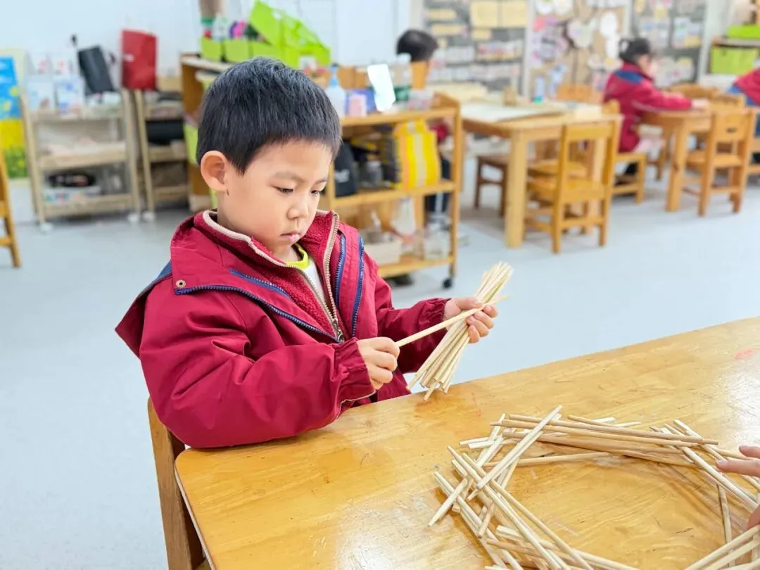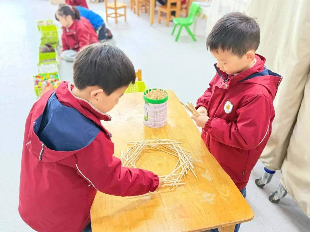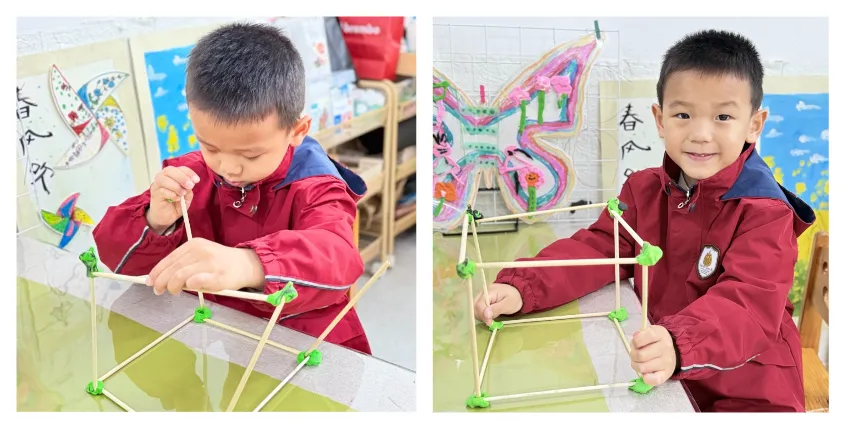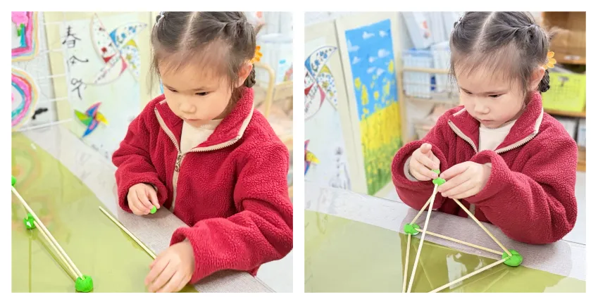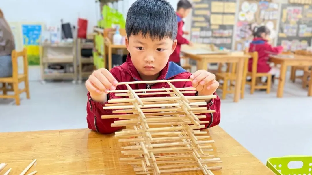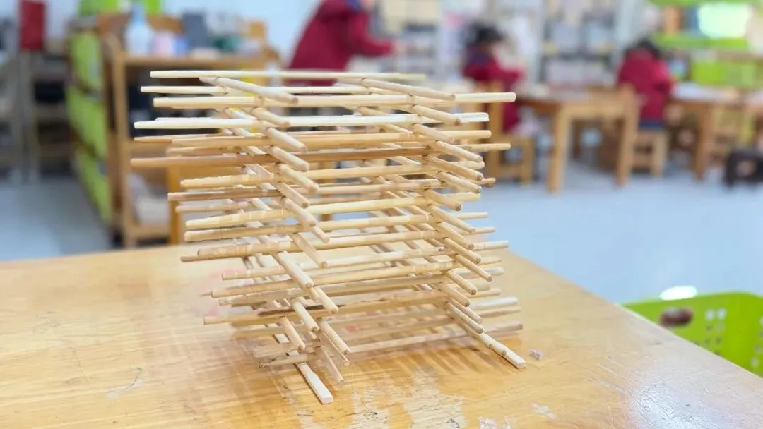 以筷子为搭建材料,孩子们自主拼搭探索,组队合作搭建“小城堡”、“露营帐篷”,在动手过程中锻炼了空间思维和手部精细动作,合作交流能力也得到了提升。