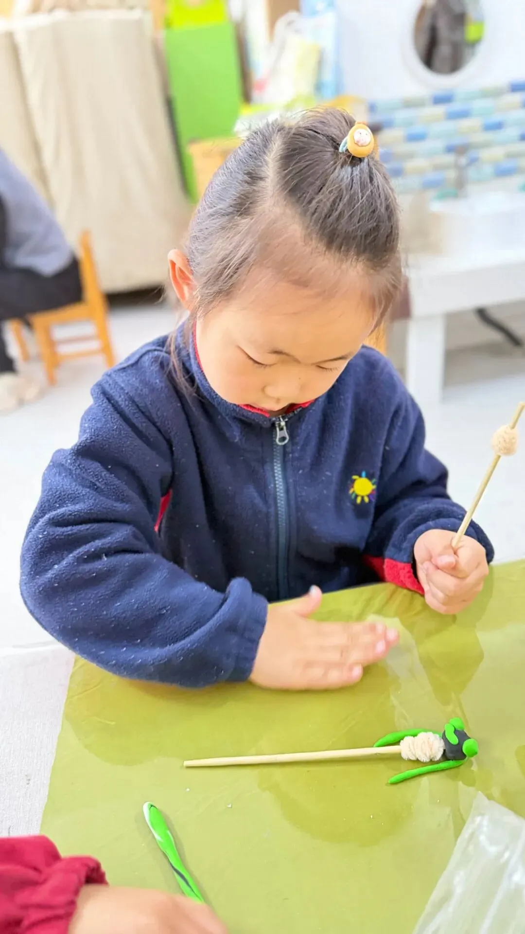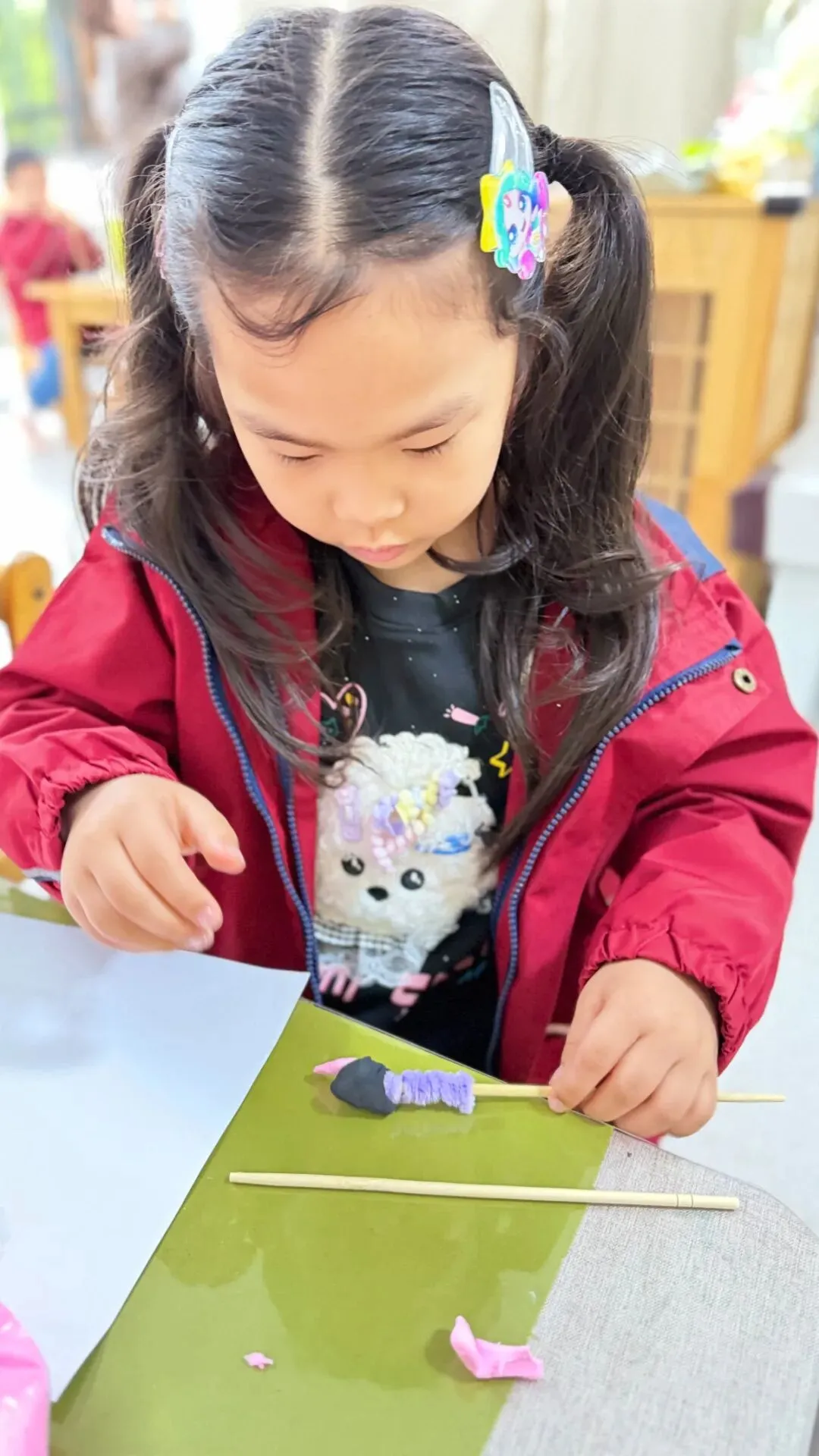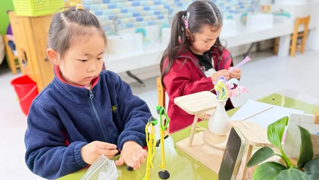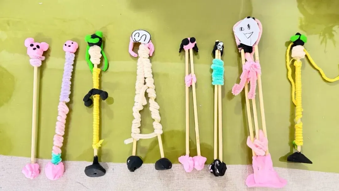 黏土、小贴纸等材料化身“装饰神器”,孩子们给普通的筷子进行创意“变装”,有的化身可爱的小木偶,还有各种各样的水果串呢!通过孩子们的创意想法,让筷子摇身变成趣味满满的创意作品。