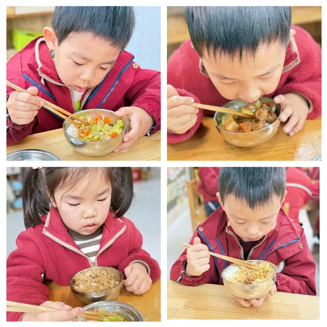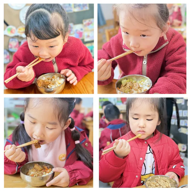 在幼儿园的午餐时光里,孩子们已经能熟练地拿起筷子,稳稳地夹起每一份饭菜,认真践行着“光盘行动”。从小心翼翼地夹起蔬菜,到稳稳夹住肉块,每一个动作都透着认真与专注。