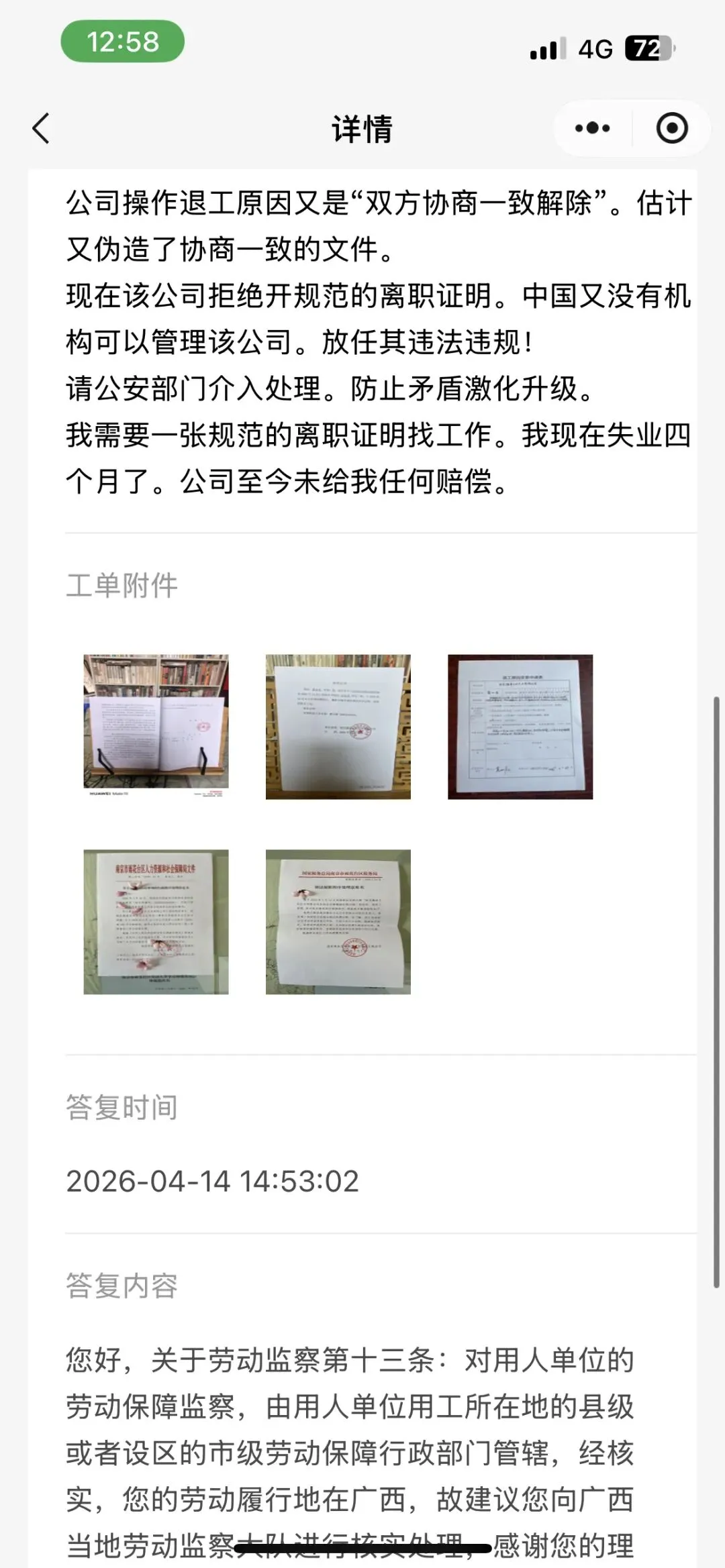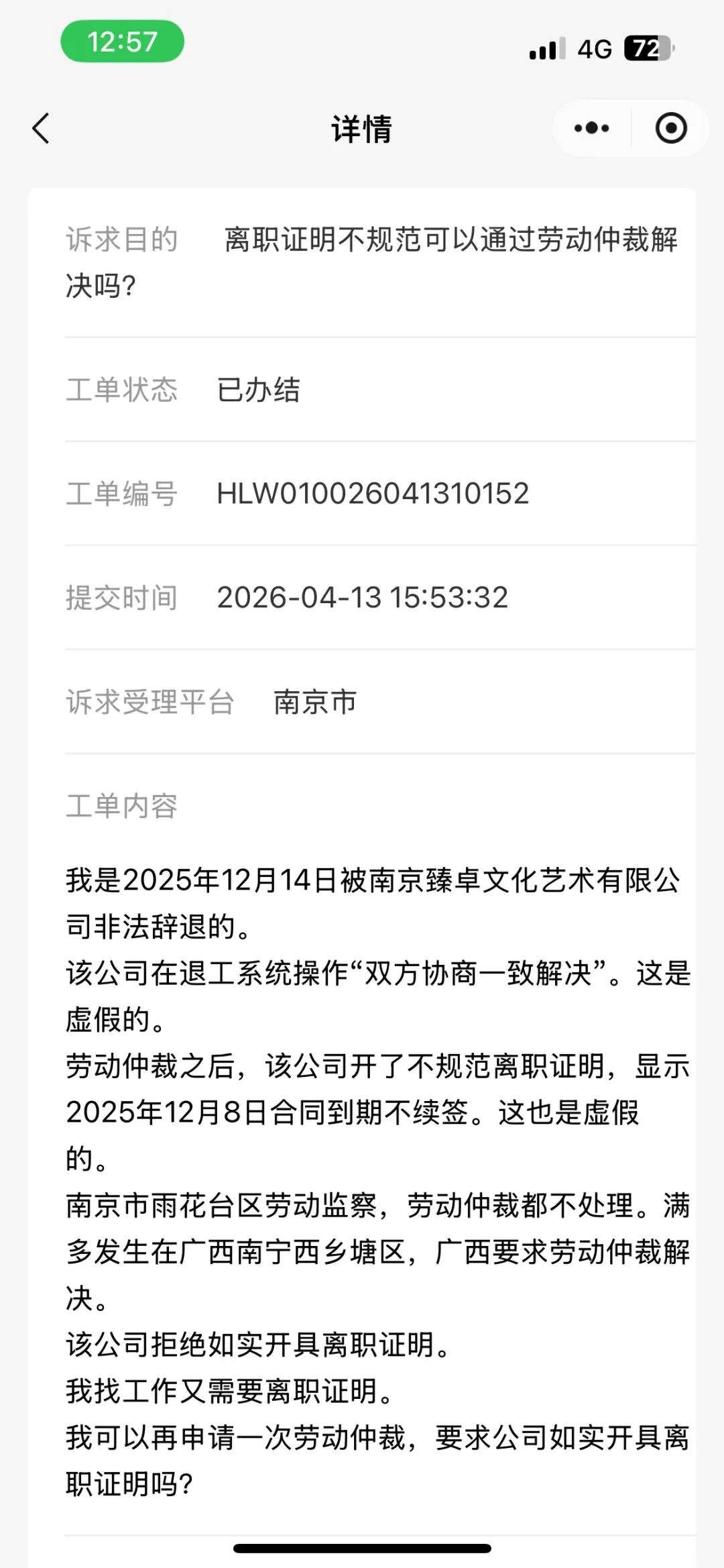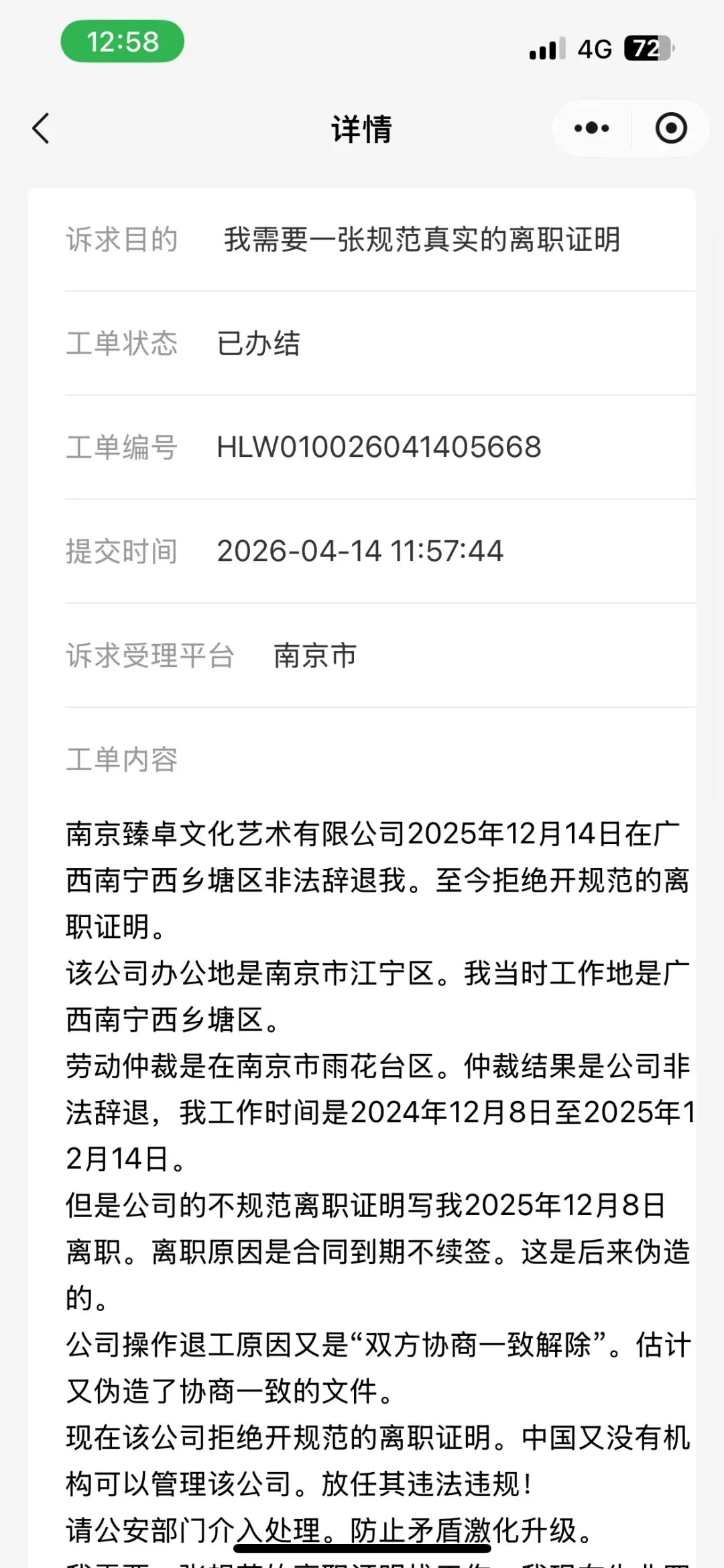 南京臻卓文化艺术有限公司拒绝如实开离职证明。南京市没有部门处理该公司违法行为!持续投诉四个月了,问题未解决。