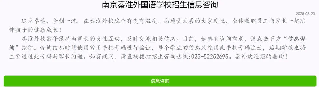 【秦外】学校招生咨询热线开通,时间为上午8:30—11:00,下午2:00—4:30。号码为:52252695,有需要咨询招生信息的,请在工作时间段拨打。