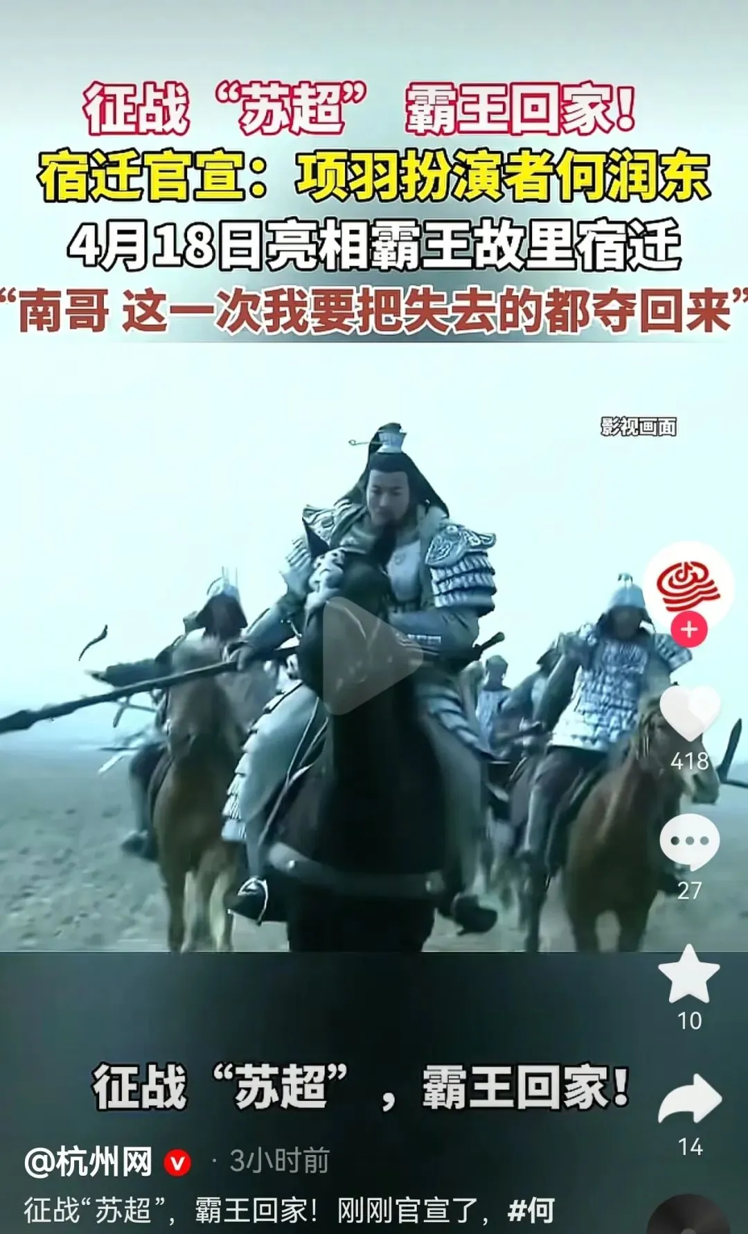 北京时间4月13日,苏超联赛宿迁对阵南京的比赛还没开打就彻底火出圈!宿迁队直接甩出“王炸”——官宣何润东将以经典项羽造型亮相赛场,“霸王回乡”助阵主队,消息一出全网玩梗大军直接占领评论区,南京文旅更是被网友“支招”整懵,评论区比球赛本身还热闹。