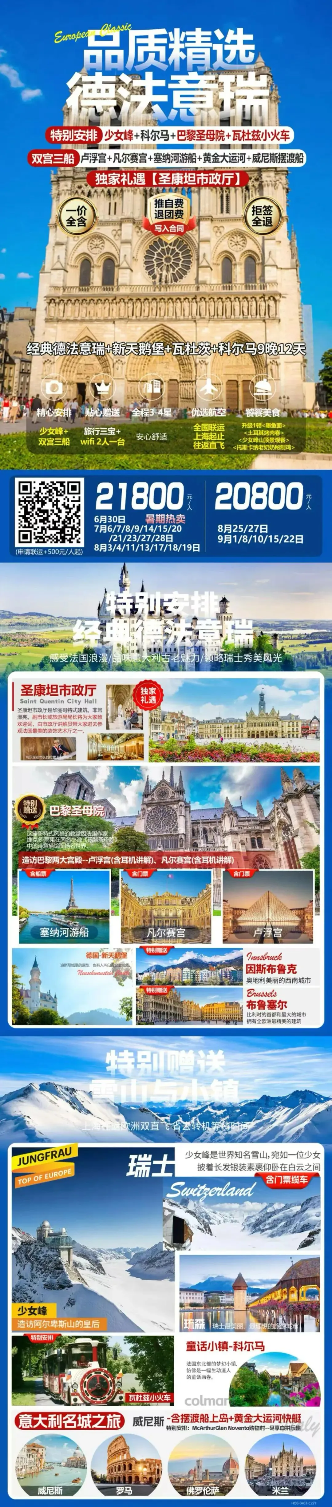 [强]真纯玩!不带钱包游欧洲[加油][加油][加油]HO6 ❤️一价全含,不推自费,安心舒适欧洲行 不带钱包游欧洲!开启你的欧洲之旅 🦋德法意瑞+童话小镇科尔马+少女峰12天 🔔上海吉祥直飞 ⛰瑞士少女峰——欧洲之巅,造访“阿尔卑斯山皇后” 🪆法国童话小镇——科尔马,法国东部梦幻小镇 💕卢浮宫耳机讲解+凡尔赛宫耳机讲解! 🔅巴黎圣母院重启,法国著名的文化地标 🦢新天鹅堡:迪士尼城堡的原型,🇩🇪德国旅游必推 🚤威尼斯水城,乘坐电影007场景中快艇,穿越黄金大运河 💐如果说巴黎最美的街道是香榭丽舍那么你一定没有体验过塞纳河上风光 🇮🇹意大利名城之旅:威尼斯/罗马/佛罗伦萨/米兰 🏨全程酒店3~4星,中式 5 菜 1 汤:特别升级 1 顿<墨鱼面>、1 顿<土耳其烤肉卷>、1 顿<托斯卡纳老奶奶秘制鸡>、1 顿<少女峰景观餐> 🌻随团搭配2人一台Wi-Fi+旅行三宝,让您随时随地分享快乐瞬间,旅途无忧!!! |