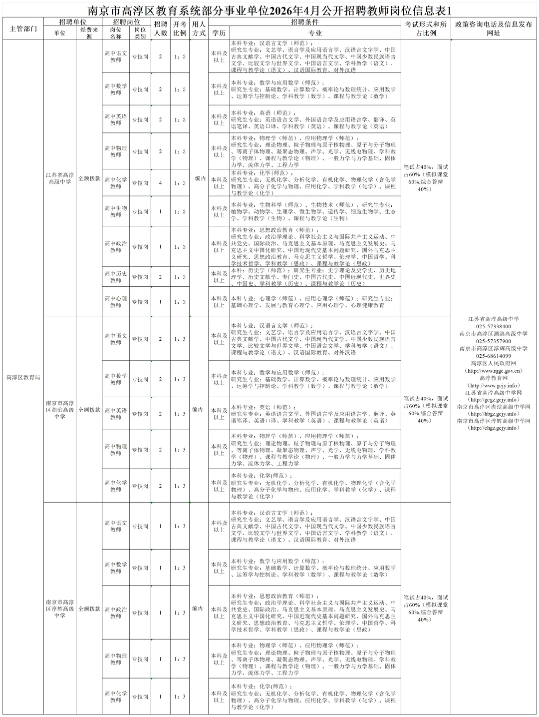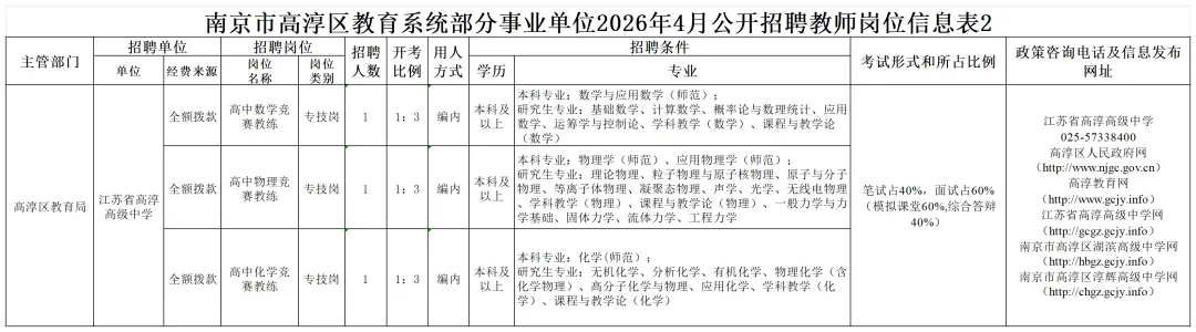 本次招聘相关信息在高淳区人民政府网(http://www.njgc.gov.cn)、高淳教育网(http://www.gcjy.info)、江苏省高淳高级中学网(http://gcgz.gcjy.info)、南京市高淳区湖滨高级中学网(http://hbgz.gcjy.info)、南京市高淳区淳辉高级中学网(http://chgz.gcjy.info)等网站发布。具体的招聘岗位、数量、资格条件等详见附件:《南京市高淳区教育系统部分事业单位2026年4月公开招聘教师岗位信息表1》及《南京市高淳区教育系统部分事业单位2026年4月公开招聘教师岗位信息表2》,以下简称《岗位信息表1》及《岗位信息表2》。