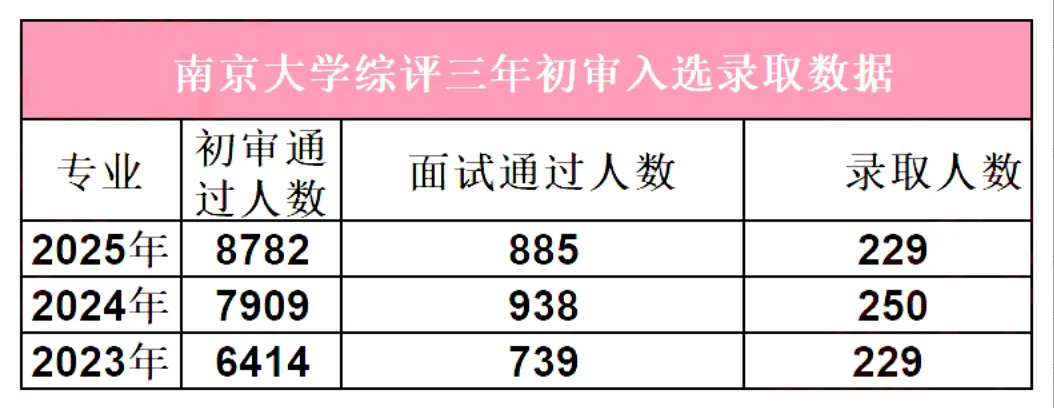 南京大学综合评价近三年报名人数以及初审通过人数呈逐年递增的趋势,但近三年的录取人数基本保持不变,2025年甚至还缩招了20人,竞争十分激烈。