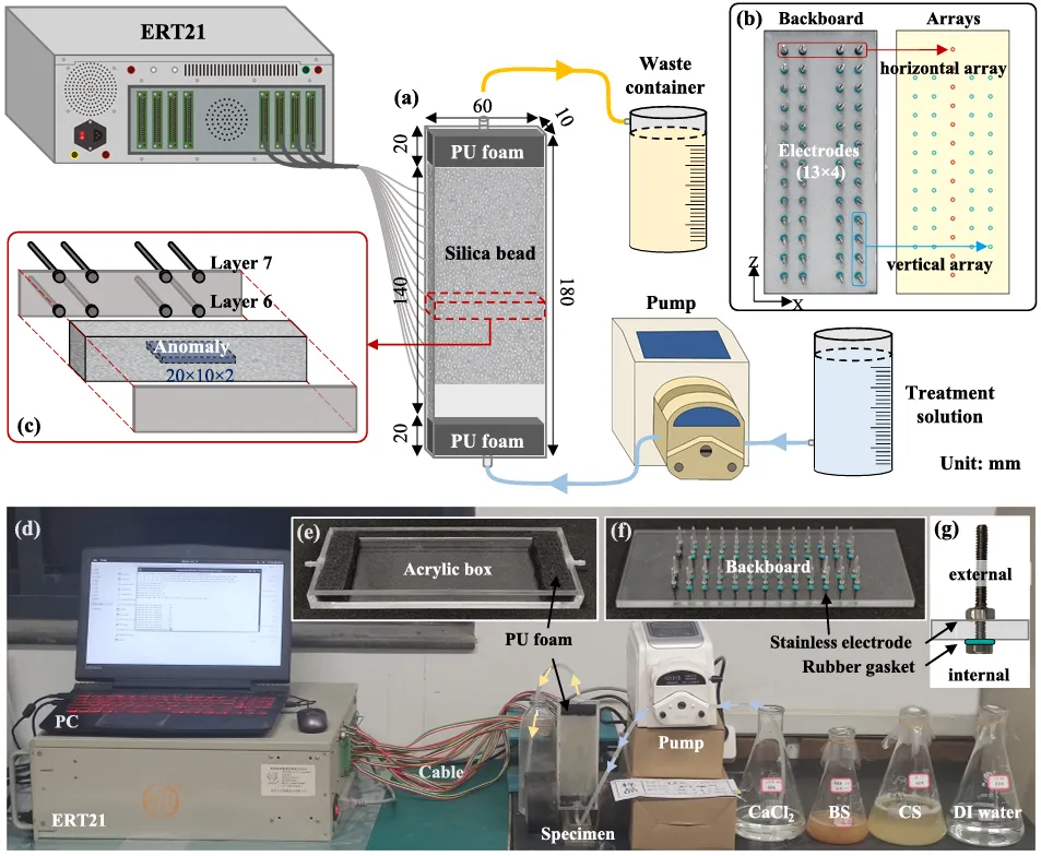 Fig. 1. Sketch and photo of the experimental setup. (a) Silica beads were packed into the acrylic box (60 × 10 × 180 mm). (b) Fifty-two stainless electrodes were installed on the backboard of the box, which was used for the electrical conductivity measurement and tomography. (c) Specimens B2 and B3 have the permeability anomaly at the center of the box, which is an acrylic sheet and a polyurethane (PU) foam, respectively. (d)-(g) Photos of the electrical measurement system (ERT21), acrylic box, electrode backboard, and stainless electrodes.