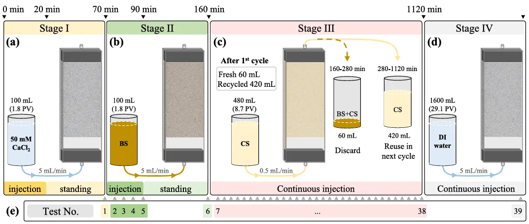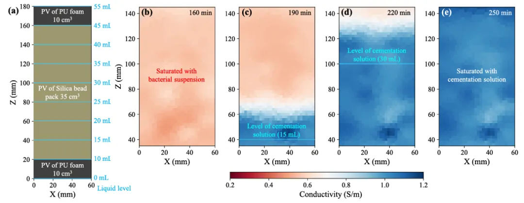 Fig. 2. Procedure of MICP treatment in one cycle (a)-(d) and the correlated electrical monitoring scheme (e). The specimen has a pore volume (PV) of 55 cm3 .