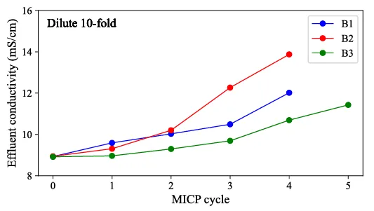 Fig. 4. Effluent conductivity (cementation solution conductivity) after each MICP cycle in the three specimens (B1, B2, and B3). Since the effluents were recycled for the next MICP cycle (see Fig. 2c), the increase in effluent conductivity can indicate the increase in ion concentration and the progress of mineralization reactions.