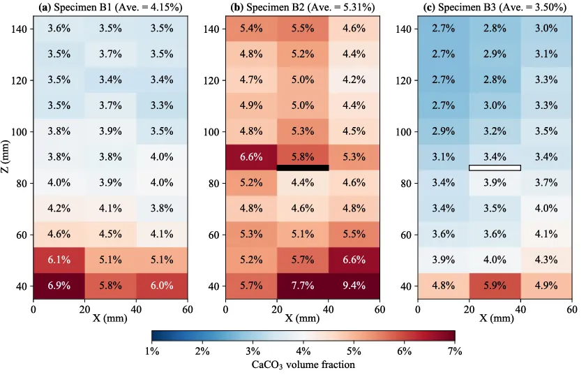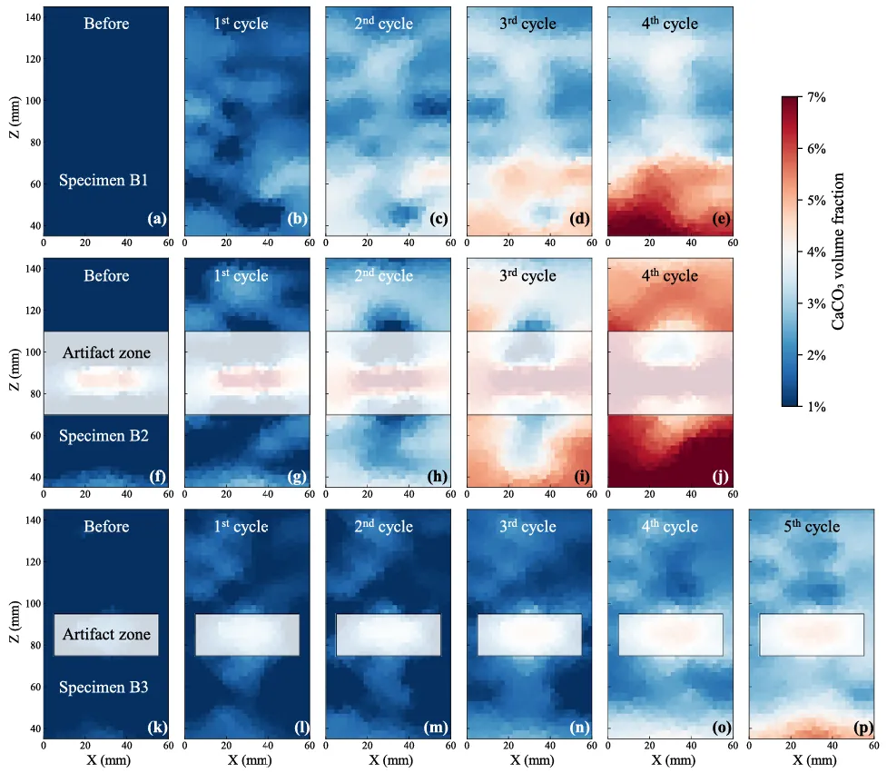 Fig. 13. Spatiotemporal evolution of the volume fraction of CaCO3 for the three specimens after each MICP treatment cycle.