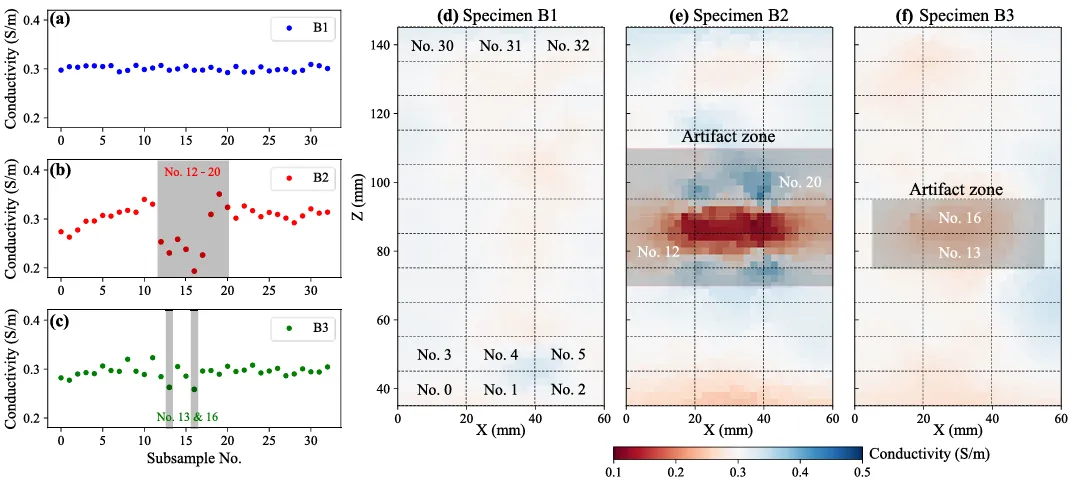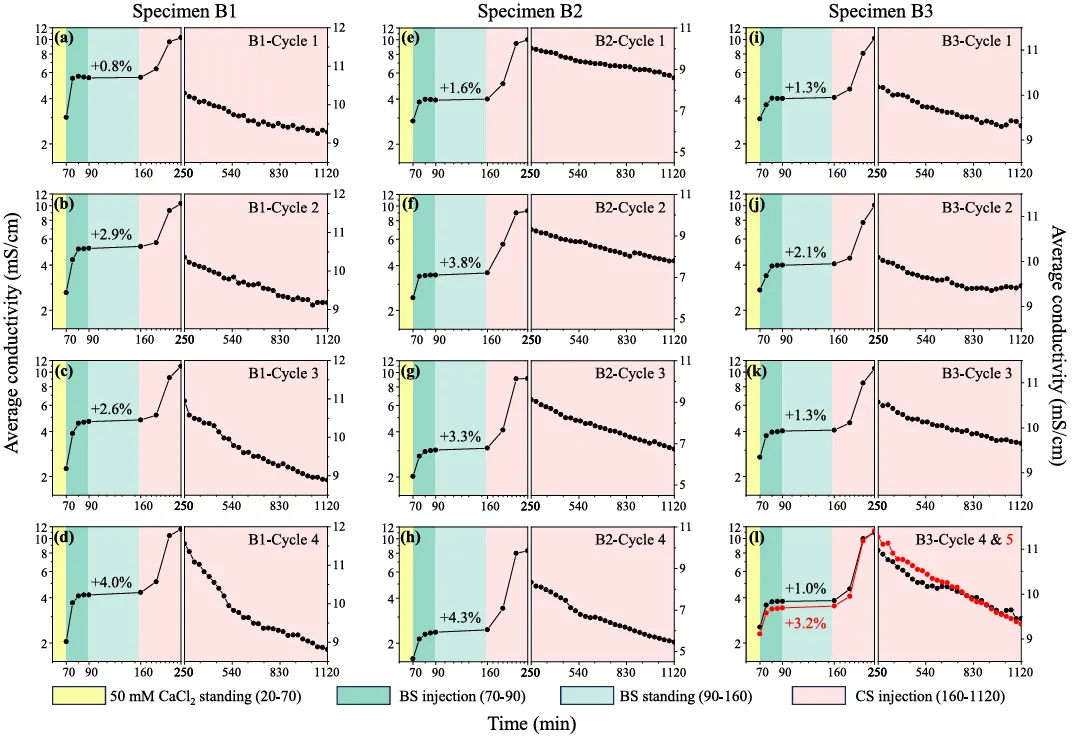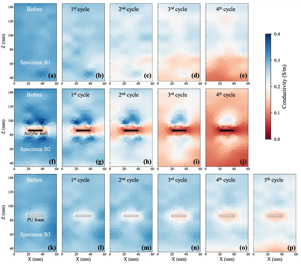 Fig. 9. Electrical conductivity tomograms before and after each MICP treatment cycle.