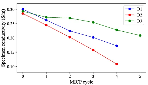 Fig. 8. Specimen average conductivity after each MICP treatment cycle.