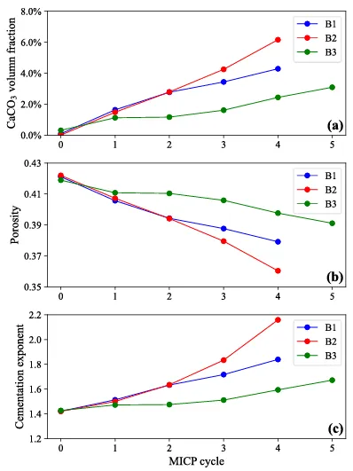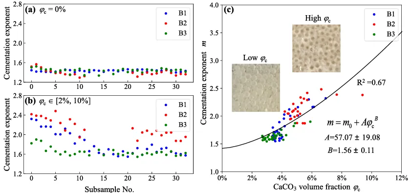 Fig. 11. . Cementation exponent m of resampled silica beads pack before and after the MICP treatment (a-b).(c) The cementation exponent m and CaCO3 volume fraction φc of the cemented silica beads were fitted with Eq. 9.