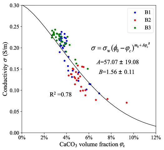 Fig. 12. Petrophysical model between electrical conductivity and CaCO3 volume fraction in MICP-treated silica bead pack.