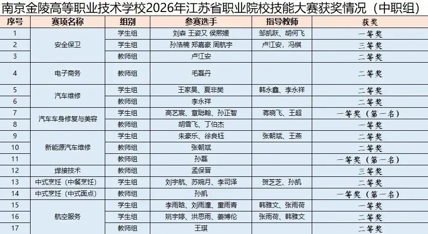 近日,2026年江苏省职业院校技能大赛(中职组)各项赛事圆满落幕。南京金陵高等职业技术学校参赛团队捷报频传、硕果累累,一举斩获6枚金牌、9枚银牌与2枚铜牌,获奖等级与数量均位列全市中职院校前列,以硬核实力充分展现了学校职业教育的深厚底蕴与卓越育人成果,为学校“十五五”期间职业教育高质量发展奠定了坚实基础、实现了良好开局。